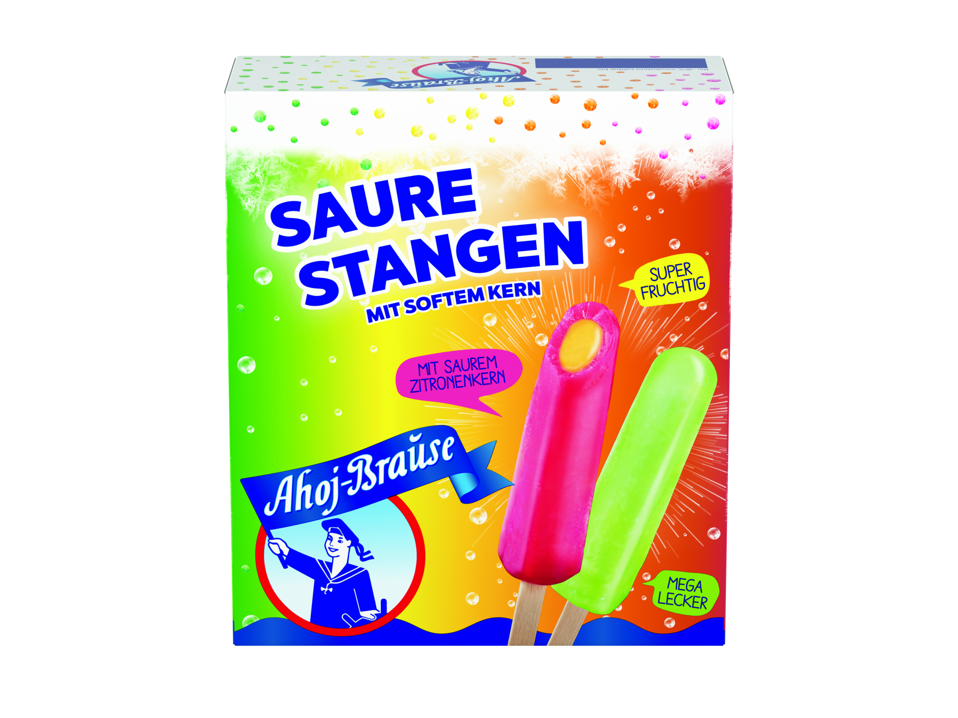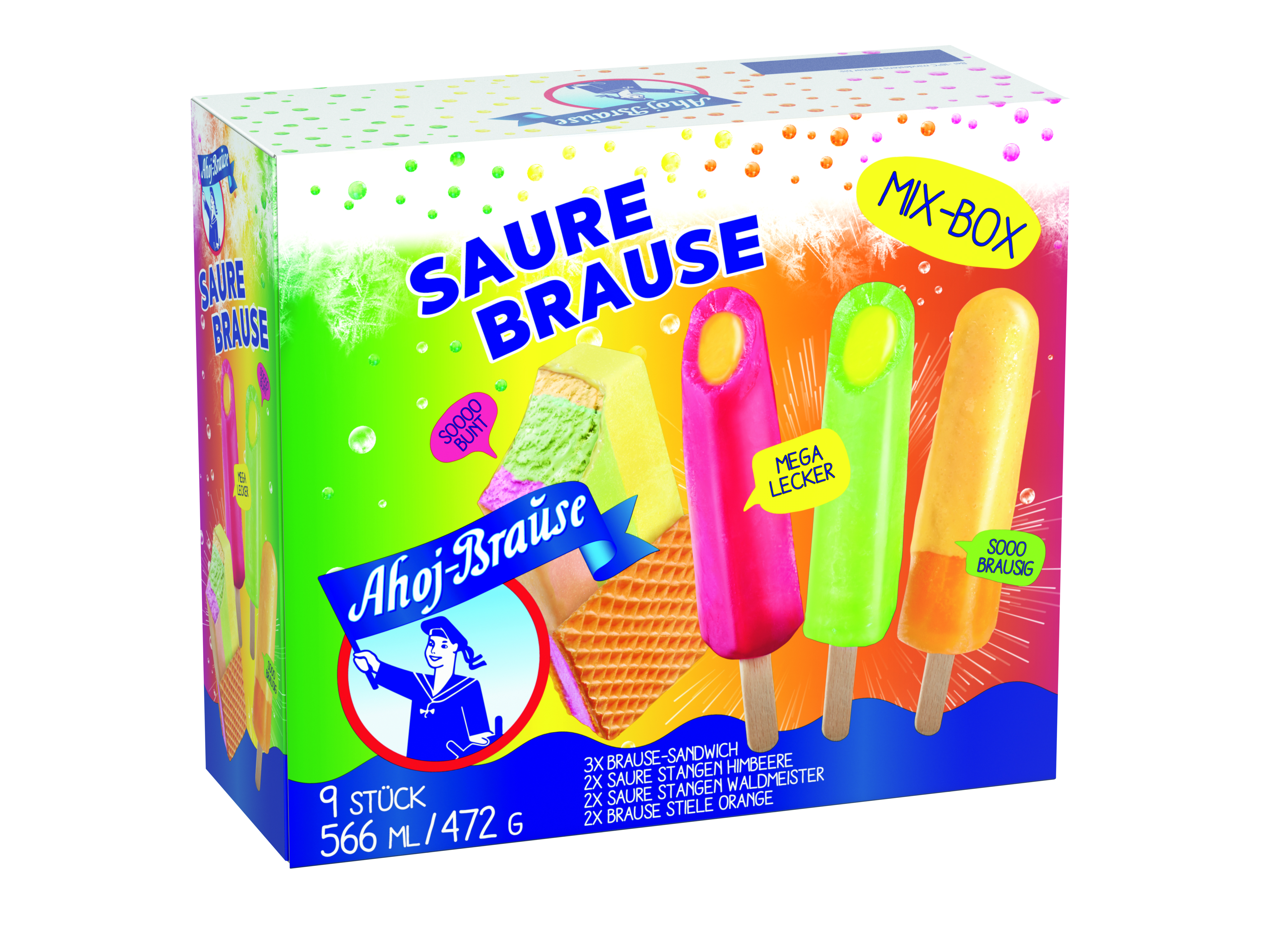 The sparkling cult brand on the ice-cream shelf - as mega-sparkling or sour sherbet fun on a stick, as a sandwich and as an Ahoj-Brause sherbet cup.